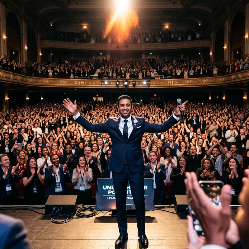A South Asian man clad in a formal suit stands on stage, a fiery spotlight illuminating him against the dark background. From his lapel, a bright buttonhole gleams. The perspective is from the stage, giving a holistic view of the auditorium scene. There are approximately 3000 spectators of diverse descents including Caucasian, Hispanic, Black, and Middle-Eastern in the grandiose hall. He is imparting a riveting training session, engaging everyone in the hall. The audience is varied, comprising of both men and women. Capturing the peak of the session, everyone in the grand hall rises to their feet, creating a thunderous standing ovation.