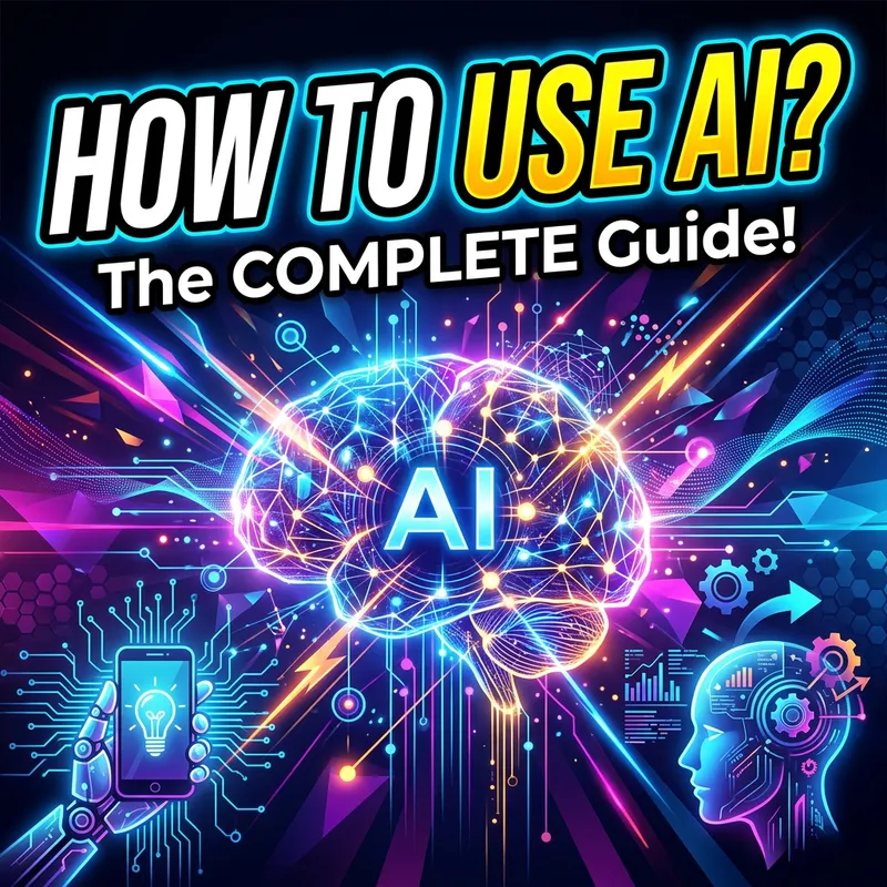 engaging YouTube thumbnail design featuring an abstract AI concept, vibrant colors with a futuristic aesthetic, bold and clear typography highlighting 'How to use AI?', digital art using sharp contrasts and energetic lines, graphic design.