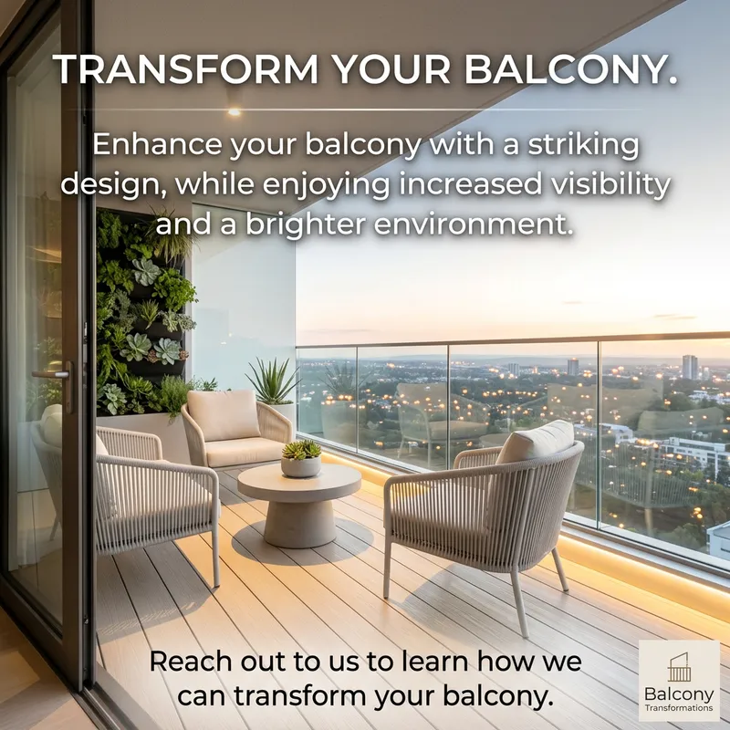 Enhance your balcony with a striking design, while enjoying increased visibility and a brighter environment. Reach out to us to learn how we can transform your balcony.