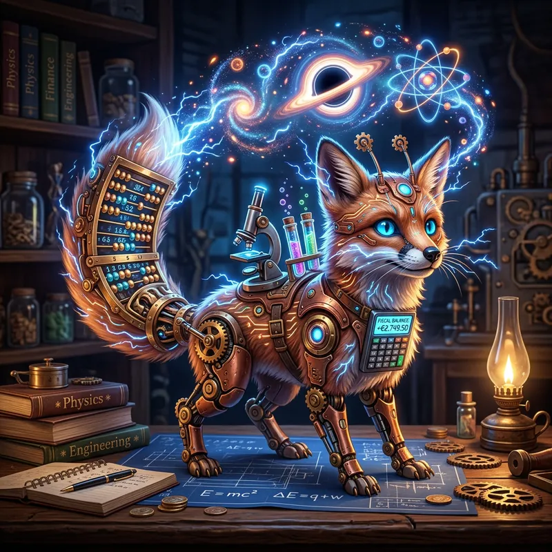 A mythical pet inspired by concepts from the fields of accounting, electricity, mechanics, science, and physics, imbued with a distinctive aura that reflects fiscal responsibility, energetic dynamics, mechanical innovation, scientific exploration, and principles of physics. It could have components resembling a calculator or an abacus as a nod to accounting, charged particles or lightning to represent electricity, gears or levers to symbolize mechanics, a microscope or a test tube for science, and a physical element like a floating orb or a mini black hole representative of physics.