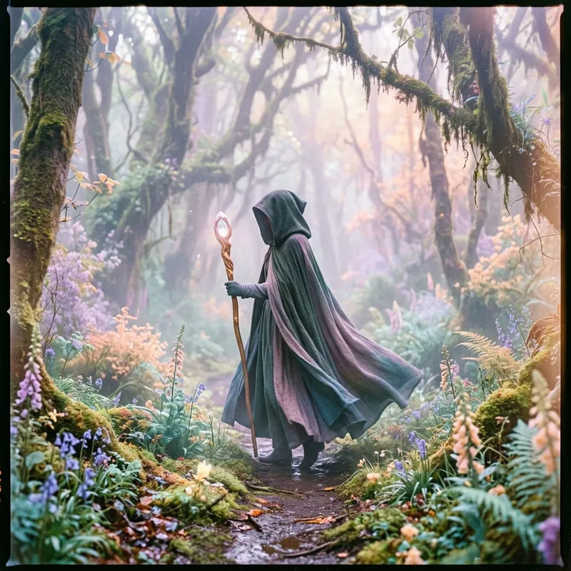 A mysterious figure, enveloped in the enigmatic ambience of a misty forest. The scene uses dreamy pastel colors, infusing the environment with a surreal and magical charm. The figure's ethereal pose only adds to the fantastical feel of this picture, making it look like a scene straight out of a fantasy novel. It's as if the vivid image was captured using an old-school vintage film camera, creating a soft lighting effect that perfectly compliments the ethereal mood of the picture.