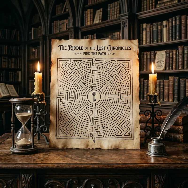 A visual representation of a mental challenge that prompts deep thinking, typically associated with a riddle. It might be a complex maze drawn on an antique parchment, with numerous twists and turns, false paths and obscured solutions, all inside a gothic library setting with wooden bookshelves filled with various old and worn-out books. The maze is flanked by two burning candles that cast long, dancing shadows on the parchment. A quill pen and an ink pot made out of silver is present on the table. An hourglass with sand slowly falling, indicating the passage of time, is also there.