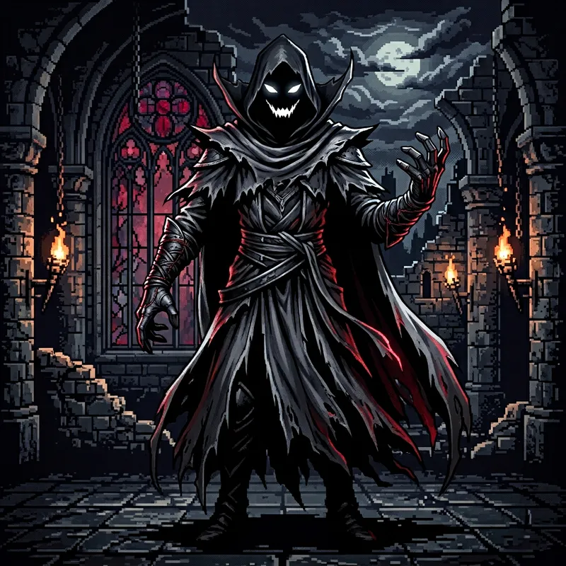 A character from a video game realm. This striking silhouette is enigmatic and mysterious, void of traditional facial features, and is primarily black and white. They embody the gothic elegance, with hands that look like they're enclosed in gloves, floating in an ominous manner. Their eyes and mouth are pure white, and their stare is piercing. The primarily monochrome palette is only disrupted by the occasional hint of red. Set this character against a backdrop of pixel art which hints towards its 16-bit era origin.