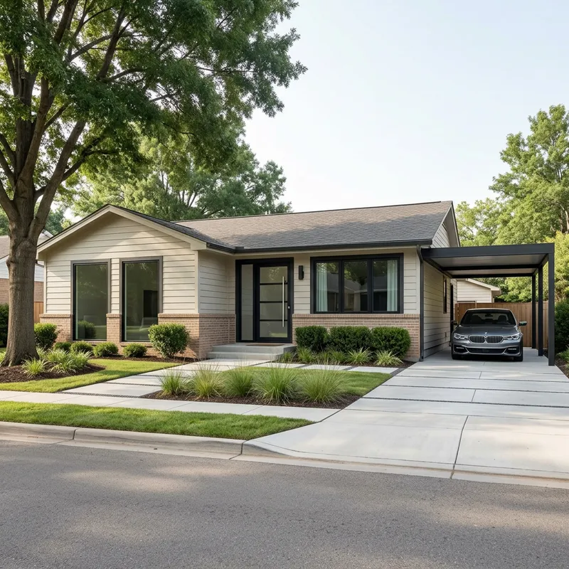 Remove the garage door and replace it with 2 windows, and replace the other windows and entry doors with modern ones. Work on the front and add a carport to the right side of the house, attached.