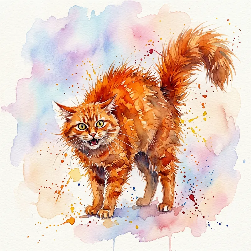 A cat, enraged with fur bristling, eyes wide and tail puffed out. Done in the soft, fluid style of watercolor painting, the cat's vibrant orange fur contrasts dramatically against a soft pastel background. Small splashes of watercolor around the cat further emphasize its movement and intensity.