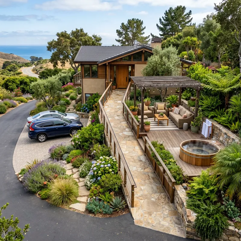 Entry ramp to a house with parking area and garden, chill out zone, and jacuzzi.