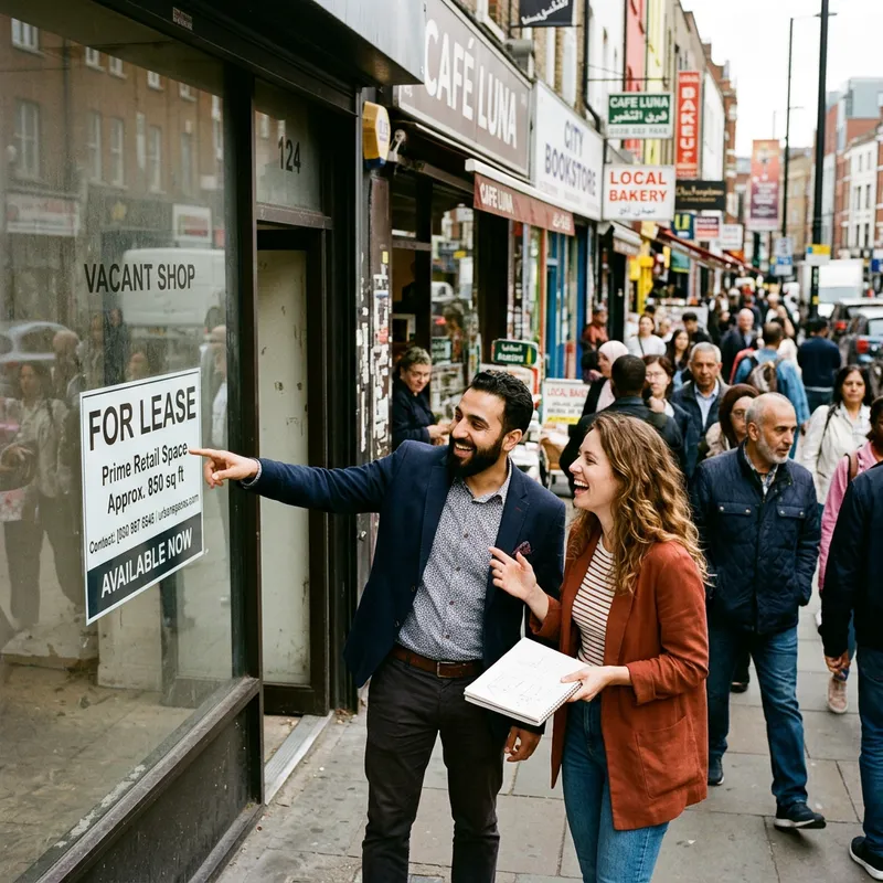 A scene showing a Middle-Eastern male entrepreneur in his mid-30s, standing in front of a small, vacant shop in a bustling city. He is visibly excited, pointing at the 'For Lease' board and discussing ideas with his Caucasian female partner. They're enthusiastically imagining their future business inhabiting the space. The streets are crowded with diverse people of different ages and descents. Surrounding shops are vibrant and full of life. This image symbolizes opportunity, ambition, and the beginning of a new entrepreneurial venture.