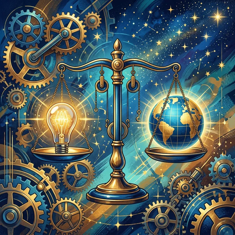 An abstract portrayal of entrepreneurship. Visualize a carefully balanced weighing scale, with one side holding a globe, signifying international market potential, while the other carries a light bulb, hinting at innovation and new ideas. In the background, interlocking gears suggest the mechanism of building and growing a business. Stars scattered across the scene signify dreams and ambitions. Different shades of blue and gold are dominant, giving an overall serious yet optimistic feel to the artwork.