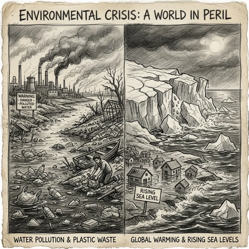 Detailed pencil sketch depicting the environmental challenges our world faces. On one side of the sketch, there must be a polluted river with plastic waste floating on the surface, illustrating water pollution. On the other side, draw melting ice caps with rising sea levels, highlighting the issue of global warming. Please ensure to accentuate the somber atmosphere and direness of the situation.