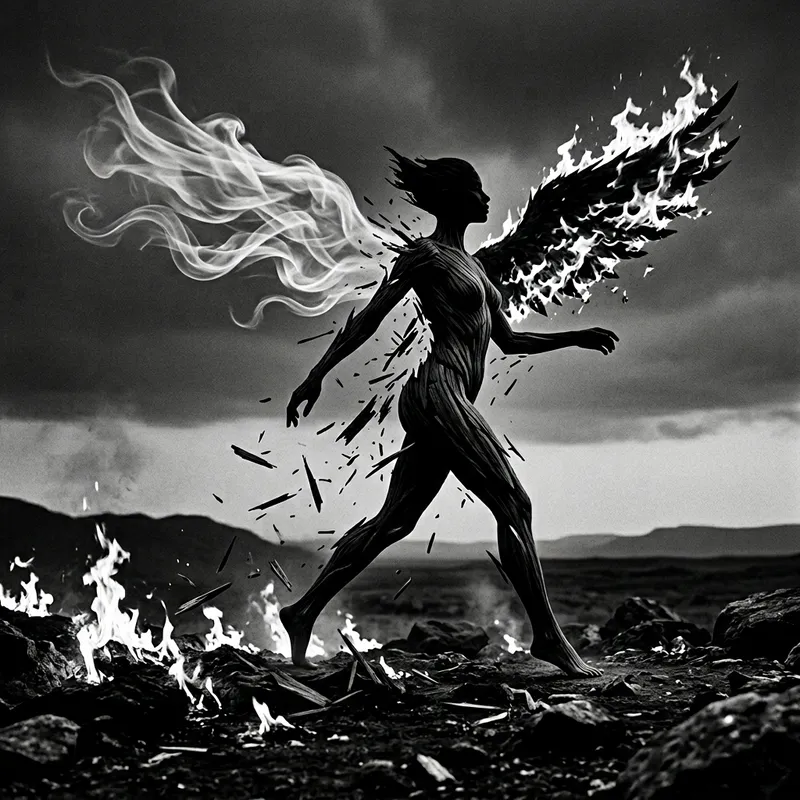 Envision a striking black-and-white silhouette of a humodel-like figure, poised in a dynamic stance as if striding into the unknown, its form defined by elegant, sweeping lines that capture both grace and power. Majestic wings emerge from its back, the right adorned with fierce, jagged flames that flicker with chaotic energy, while the left flows like wisps of soft smoke, curling gently into the air as if caught in a gentle breeze. This ethereal being bears a textured body reminiscent of ancient wood, appearing to splinter and break apart into delicate shards, which cascade down to a rocky ground where sporadic flames lick towards the sky on the left, creating a poignant contrast of destruction and beauty. The overall composition exudes a minimalist elegance, inviting the viewer to trace and color the figure’s transformation, a poignant dance between solidity and the fleeting nature of existence.