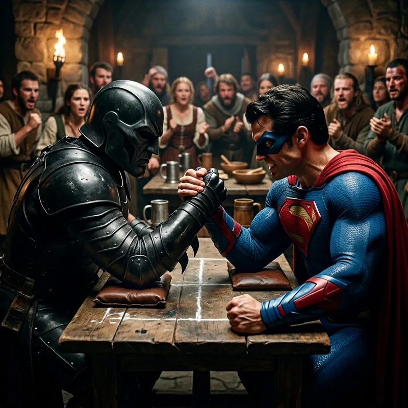 An imposing figure, clad in entirely black armor with a mask that mimics a tragically dark knight from a medieval tale, is engaged in a spirited arm wrestling match with another figure who defines the epitome of strength and justice. The latter is adorned in a suit of saturated blue with a red emblem on the chest, and a flowing crimson cape. Both figures are exerting immense power, locked in an epic battle of strength where neither seems to be giving way.