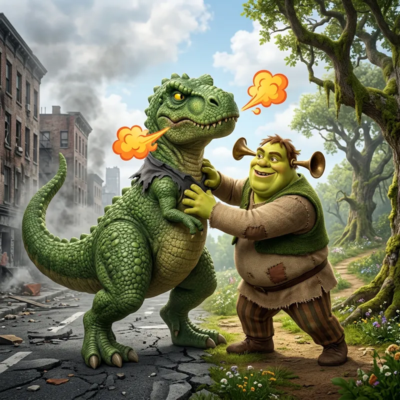 A giant green dinosaur-like creature with rough, bumpy skin, sharp teeth, a strong tail, and fiery breath battles with a large, tubby, friendly-looking ogre with ear trumpets, wearing rustic clothing. They're engaged in an epic struggle, surrounded by a chaotic cityscape for the giant creature, and a serene, fairy-tale forest for the ogre. The contrast is stark and amusing, showcasing the absurdity of the encounter. The actions in the scene look playful rather than violent, striking an interesting balance between intensity and humor.