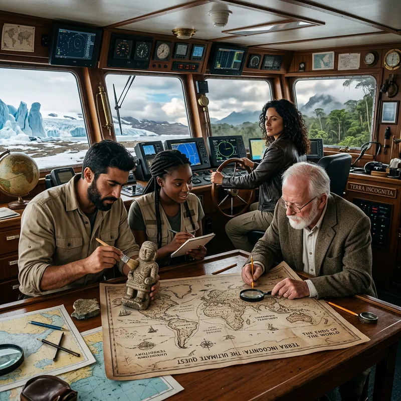 Imagine a brave group of explorers setting out on the ultimate quest. They are embarking on a journey to the ends of the world. Picture them hovering over a map marked with unknown territories. In this team, there is an elderly Caucasian male cartographer diligently studying the map, a young African female marine biologist with a curious gleam in her eyes, an adventurous Middle-Eastern male archaeologist dusting off ancient relics, and a fearless Hispanic female pilot ready at the helm. Around them, the ship's interior is a blend of modern technology and antique charm, displaying the dichotomy of their mission. The elements outside the ship hint at various climates, from icy tundras to dense jungles, symbolizing the diverse destinations they are set to explore.