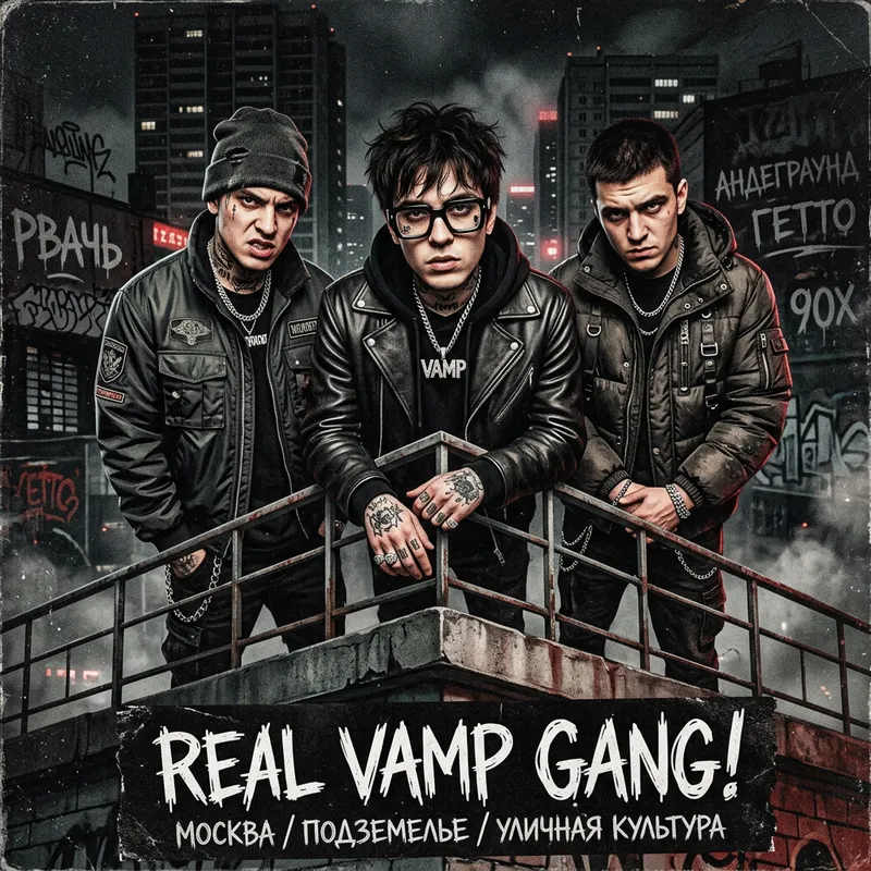 Create a fan poster featuring three cool, young (around 20 years old) Caucasian Russian rappers. One of them is wearing square glasses. They all look down from above in an imposing manner. The poster captures the essence of a mysterious and dark style, reminiscent of popular movements of the late 20th century, where numerous elements merge to create an atmosphere of urban rebellion and underground culture. Add the text at the bottom, 'REAL VAMP GANG!'.