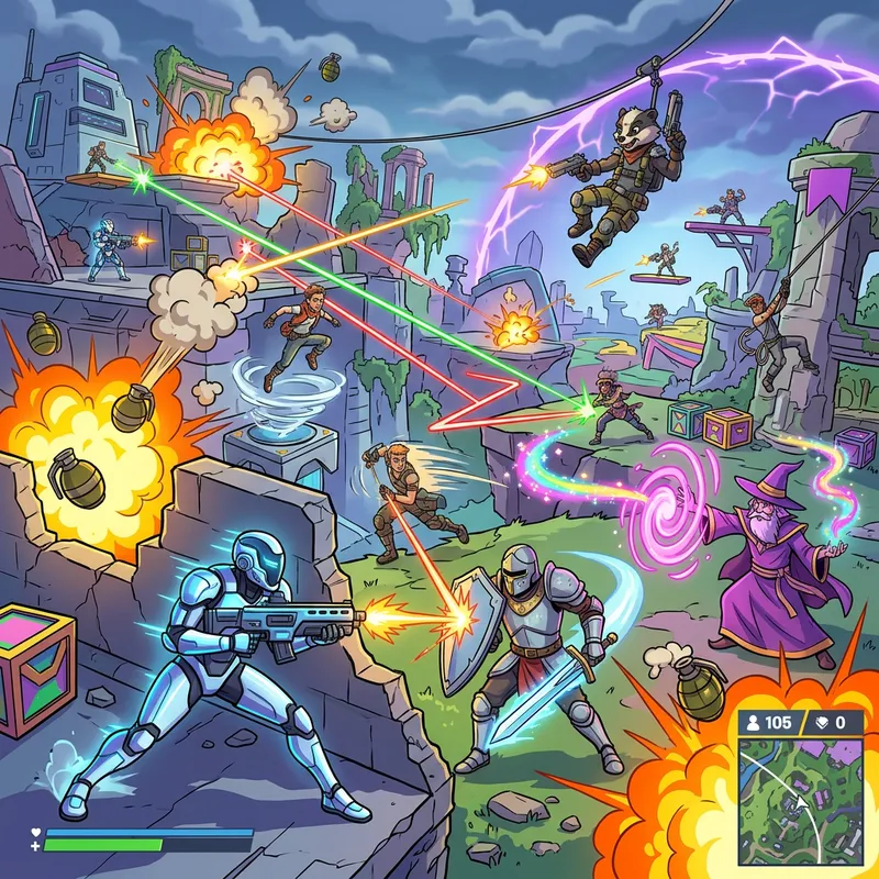 A chaotic scene from a stylized battle royale video game, with various characters engaging in a hectic battle. Each character is wildly different, with some sporting futuristic armor suits, others wielding medieval weapons, and some displaying magical abilities, all with an animated cartoon style. Great emphasis is on the variety and intensity of the bombardment, with a variety of visual effects such as exploding grenades, laser beams, colorful magic spells, and characters jumping, dodging, and fighting. Yet despite the chaos, the scene is devoid of gore or explicit violence.