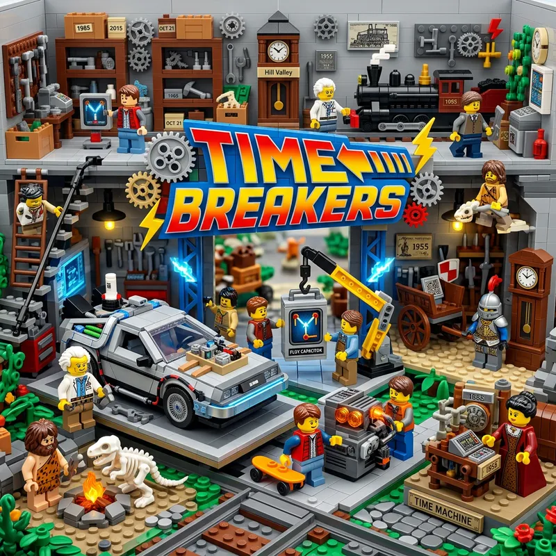 An intricate scene made entirely out of Lego blocks, inspired by the theme of 'Back to the Future'. There are various characters each performing their activities, perhaps building a time machine or interacting with relics from different periods. There's a large, distinct sign in the midst with the text "TIME BREAKERS" in bold, colorful letters. Despite all the action, the theme of 'Back to the Future' and the textual indication are clearly separated, providing a visually balanced and captivating Lego setup.