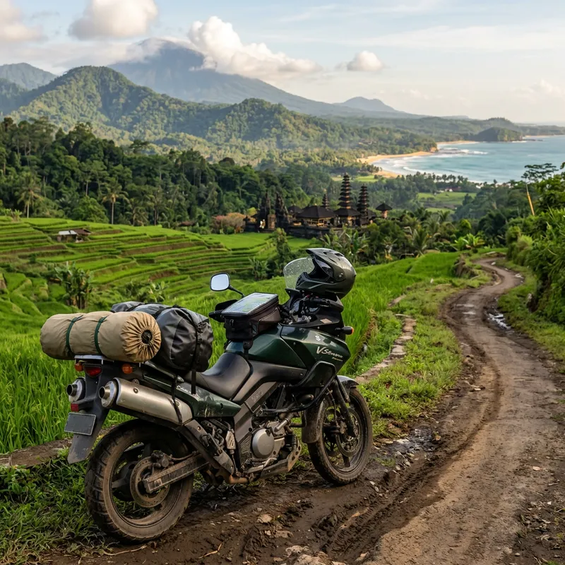 A tourist's dual-sport motorcycle, designed for both on and off-road use, parked on the edge of a dirt road. The vista behind it reveals a diverse landscape typical of Indonesia, including lush green rice terraces, verdant rainforests, mountains cloaked in mist, intricate temples nestled among the vegetation and breathtaking beaches. The motorcycle is packed with essential gear for a long journey such as a tent, a map, a duffel bag, and a helmet. The color of the bike blends harmoniously with the shifting palette of the natural background, echoing the carefree spirit of adventure and exploration.