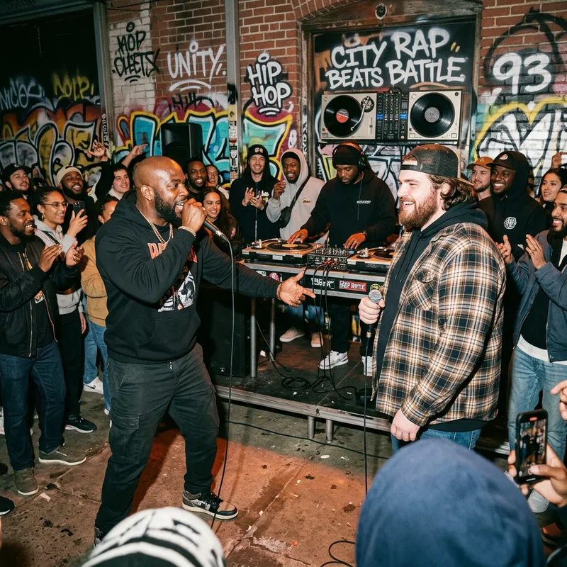 A muscular African-American man with a bald head and a large Caucasian man with thick brown hair are engaged in a friendly rap battle. They are standing in a classic hip hop setting, complete with graffiti walls, a DJ behind them spinning vinyl records, and a crowd of mixed genders and diverse descents gathered around. The African-American man gestures intensely as he delivers his rhymes, while the Caucasian man eagerly awaits his turn to counter with his own lyrics.
