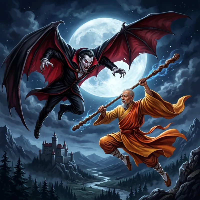 Illustration of a vampire, inspired by the myth of Count Dracula, swooping down from the night sky with his cape spread wide like a bat's wings. He is engaged in a mystical mid-air battle with an ancient Chinese monk, who is leaping upwards, wielding a staff with expert precision. The monk is elderly, Asian and has a serene composure, even in the heat of the battle. Dracula appears as a Caucasian male, his eyes glowing red, sharp fangs bared in a fury-filled snarl. Their battle takes place against the backdrop of a hauntingly beautiful moonlit night.