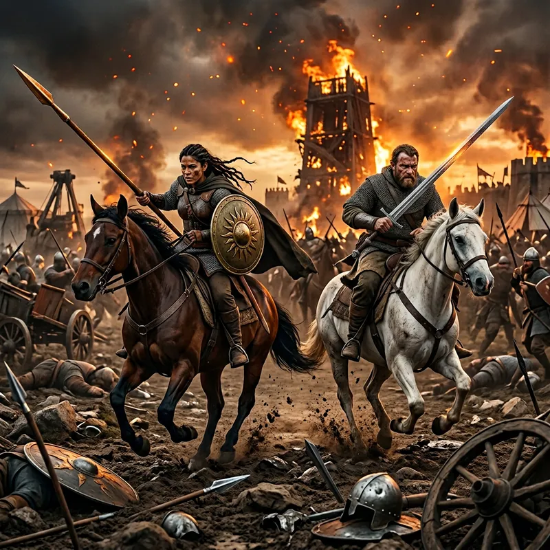 An intense battle scene showcasing two warriors, one of Hispanic descent, female, equipped with a bronze shield and a shining lance, riding a robust bay horse, and the other, a Caucasian male warrior, mounted on a sturdy white horse, wielding a mighty two-handed sword. They are strategically advancing in a war-ridden area filled with remains of chariots and fallen opponents, battered armor littered about, and the sky turned fiery with the chaos. Towering siege machines and war tents stand stark in the distance, while desperation and courage linger in the air.