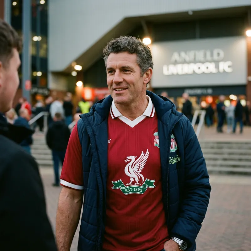 A notable figure who was a professional football player, with a strong build and a charismatic aura, wearing a red shirt of an English football team with a bird depicted on the emblem