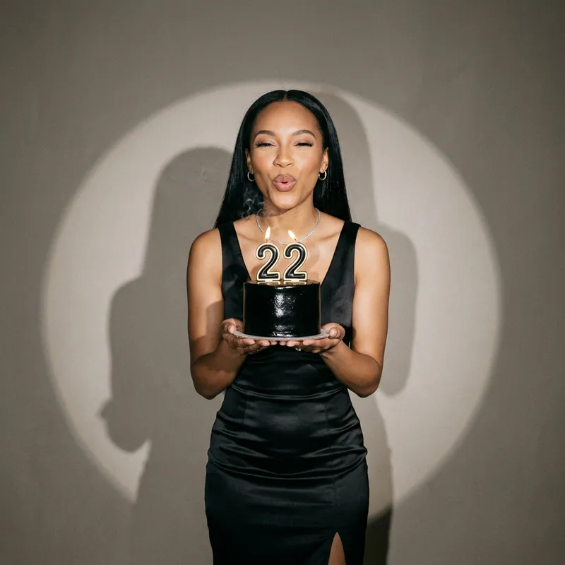 This is my face. Create a glamorous portrait photo session for my birthday with flash. The background is a simple neutral wall lit by a round spotlight, casting a sharp and dramatic shadow behind me for a cinematic effect. I am posing front-facing, as if blowing out the candles on a glossy black cake that I am delicately holding with both hands. The cake is topped with lit candles number 22, their warm glow adding a touch of celebration. I am wearing a fitted sleeveless black satin dress with a slit, creating a sense of luxury, editing. My hair is very straight and long. My expression is playful yet balanced, with my lips pursed as if in the middle of blowing, capturing the exact moment of birthday magic. The outfit is elegant, cinematic, and modern – a perfect balance of sophistication and fun, styled like a high-fashion birthday campaign.