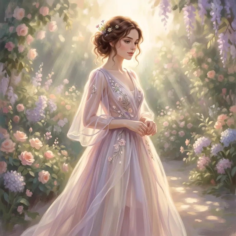 Visualize a digital painting of a young woman with natural allure, clothed in a semi-transparent, ethereal gown with her posture executed gracefully. She is located in a halo of sunlight within a mesmerizing garden. Your interpretation should reflect a soft focus approach with a gentle palette of pastel colors and angelic lighting. The technique used should be reminiscent of soft brush strokes conferring an air of a fairytale inspiration.
