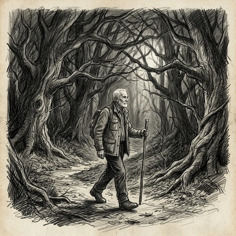 A sketch-like illustration in graphite pencil detailing an elderly Caucasian man engaged in a solitary walk within a shadowy, mysterious forest. The surrounding trees loom large, their gnarled branches reaching out and forming an intricate maze of lines and shadows. The dimly lit path under the man's feet is uneven and filled with fallen leaves. A slight hint of an ethereal glow breaks through the dense foliage, casting long, dramatic shadows and lending a sense of depth and intrigue to the scene. The man's expression is peaceful, yet determined, as he traverses this hidden, nocturnal world.