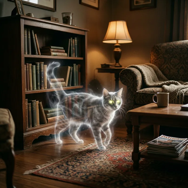 A playful scene takes place inside a cozy, dimly lit room as a ghostly apparition of a cat appears. Its body is partially transparent, an ethereal blend of chalky white and soothing gray. The specter cat has bright, glowing eyes that pierce through the shadowy surroundings. Every strand of its fur seems to shimmer with an unearthly glow. The cat casually wanders through traditional wooden furniture, not disturbing a single item. Its presence brings an eerie, yet comforting ambiance to the room.