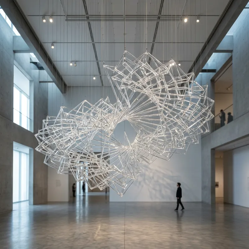 A mesmerizing installation featuring a clear glass sculpture patterned in the tribonacci sequence, suspended 8 feet from the ground. The image is taken from a wide-angle perspective to highlight its intricate details, minimalist aesthetic, and geometric precision. The ethereal atmosphere surrounding this abstract creation intensifies its enigmatic beauty.