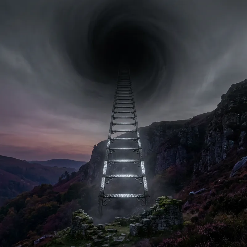 Visualize a supernatural scene with a ethereal ladder, embossed in shimmering silver hues, appearing to vanish into an infinite void of absolute nothingness. The setting emanates a serene yet eerie calmness. The ladder has an archaic style, perhaps seen in ancient dwellings, but its metal composition adds a contemporary touch. The surroundings are painted with an array of colors gradually fading into bleak monochrome as they approach the void, emphasizing the palpable contrast between existence and emptiness. The image should encapsulate the awe, dread, and fascination one might experience on the precipice of the unknown.