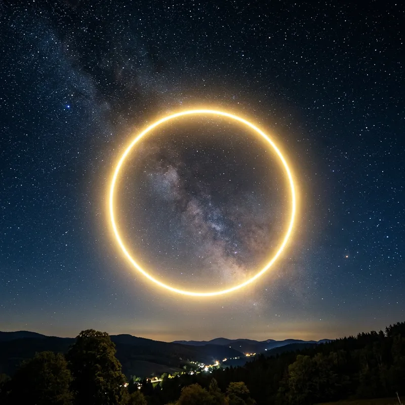 Visualize a radiant halo of soft glowing light that's suspended in mid-air against an ethereal background of twilight sky filled with stars. The halo is perfect and circular, emitting a sublime golden hue. Its brilliance contrastingly stands out amidst the vast obsidian star-dappled expanse, creating a serene and divine atmosphere.