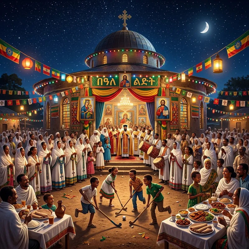 A festive scene commemorating the Ethiopian Orthodox Tewahido Christian Christmas. Features an Ethiopian Orthodox Church, decorated with traditional patterns, colourful lights, and religious imagery. Inside, worshipers of diverse genders and varied Ethiopian ethnic groups are engaged in prayer and celebration, wearing customary attire with crosses. Outside, children are joyfully playing traditional games. Ethiopian cuisine specially prepared for the occasion is laid out on tables. The night sky above is clear and starlit, reflecting a peaceful atmosphere.
