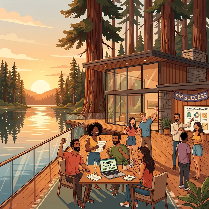 Vector illustration of an ethnically diverse global project management team with members of various genders, all expressing excitement and happiness about their work. They are located in a mid-century modern house nestled among towering redwood trees, set by a serene lake bathed in the soft light of the golden hour, which casts long, languid shadows. Reflections of the setting sun twinkle in the still waters of the lake. Surroundings emit the warmth of a delightful summer evening.