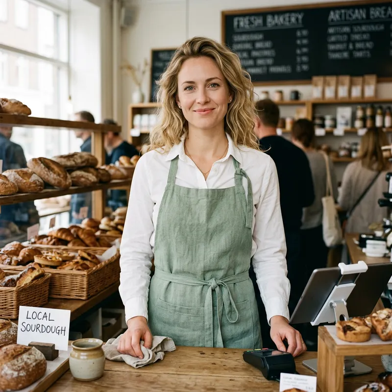 European Female Salesperson with Blonde Hair in Stylish Green Apron