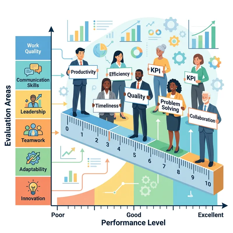 An illustrative depiction of different criteria or specific measures being used to evaluate performance. This includes a large scale with numerical gradations and indicators, on which multiple figurines representing diverse individuals of various gender and descent are standing. Each of them is holding a sign with key performance indicators such as 'productivity', 'efficiency', 'timeliness', and 'quality'. Other visual elements are a proportionally marked horizontal axis that represents varying levels of performance from 'poor' to 'excellent', and a vertical axis indicating different areas of evaluation such as 'work quality', 'communication skills', 'leadership' etc.