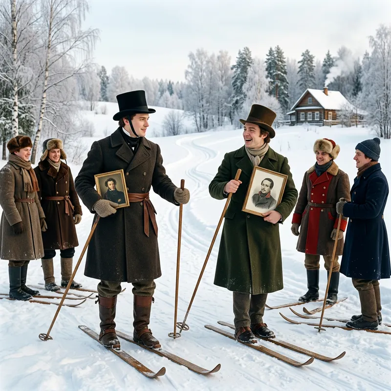 Two classic literary figures, similar in look to Evgeny Onegin and Vladimir Lensky, completely clean-shaven and wearing top hats, are skiing with friends. They are each holding a portrait of a famous poet from the late 18th-early 19th century who greatly influenced Russian literature. The scene is set in a wintry landscape with the friends around these literary figures also skiing and enjoying their time. All are dressed appropriately for the cold weather and are having a charming time, seamlessly combining an appreciation for literature with winter sports.