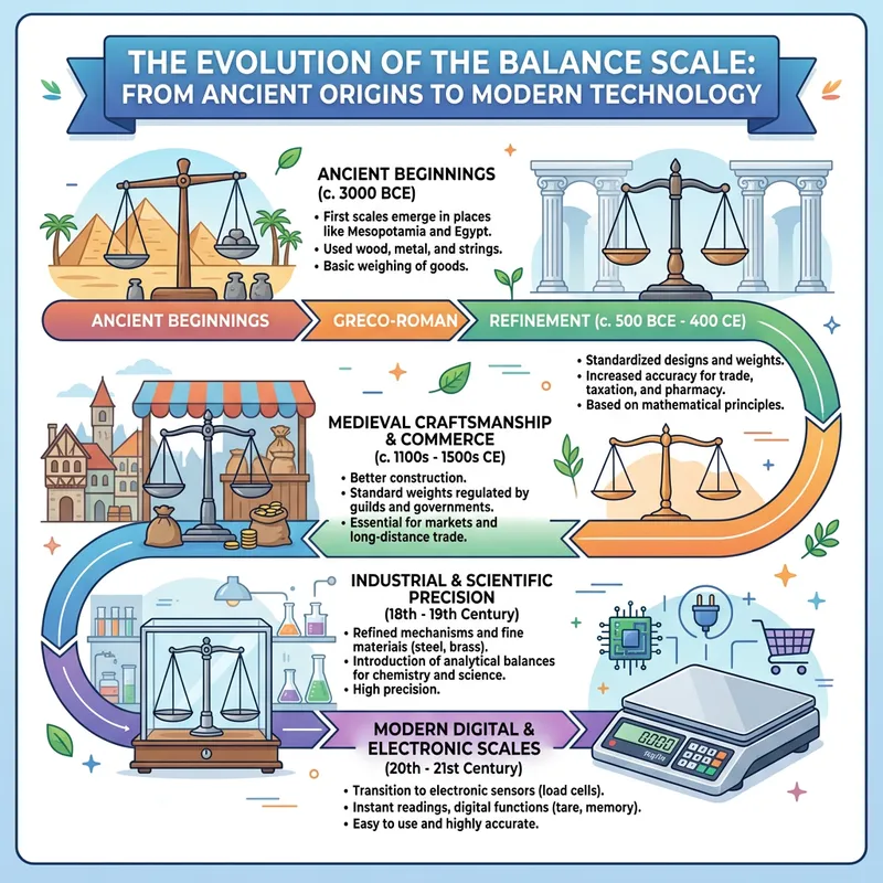 Create an easy-to-understand timeline of the evolution of the balance scale, with simple illustrations and brief informational captions accompanying each significant development or period.
