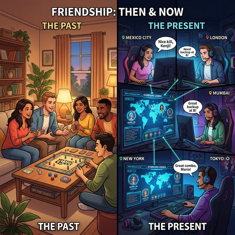 Illustrate an image detailing the transition from traditional face-to-face friendships to virtual connections that have been facilitated by the growth of online gaming. Show a split-screen image, one side reflecting the past where a diverse group of people (men and women from different descents like Caucasian, Hispanic, South Asian etc.) are chatting and laughing while playing a board game together in a brightly lit, comfortable living room. The other side portraying the present, where the same people are seen each in their own rooms lit by the glow of their computer screens, engaged in an online multiplayer game, depicted by futuristic UI elements showing a global map and player avatars.