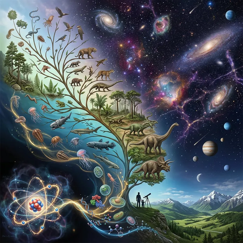 A detailed, realistic visualization of the incredible evolution of life. Begin from the smallest level, a tiny atom bustling with energy, before ascending into the scale of biological life, showcasing the diversity and complexity of organisms. Let these forms eventually transcend into a beautiful representation of the heavens, filled with dazzling stars, galaxies, and cosmic phenomena, indicating the interconnectedness and grandeur of the universe.