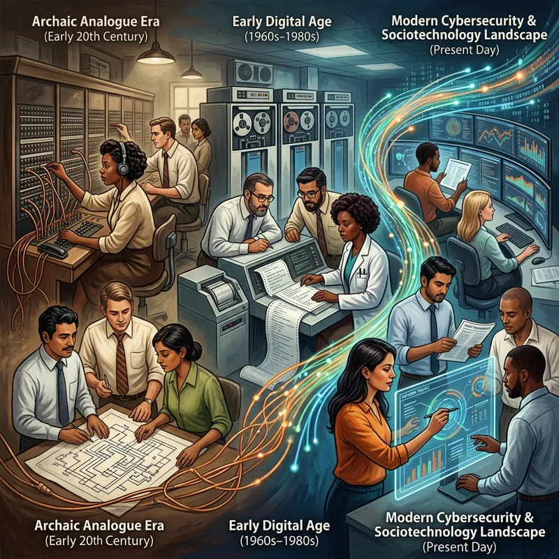Illustrate an insightful interaction between the fields of sociotechnology and cybersecurity. Display the progression of technology over time, transitioning from archaic analogue systems to advanced digital systems. By showing humans alongside, emphasize the significant role they play. Show humans from various periods, each interacting with the technology of their timeframe, highlighting their influence on its development and evolution. Ensure that the illustration conveys the importance of centring technological development on human needs and experiences. Feature people from diverse descents such as Caucasian, Hispanic, Black, Middle-Eastern, South Asian, working in harmony with technology over generations.