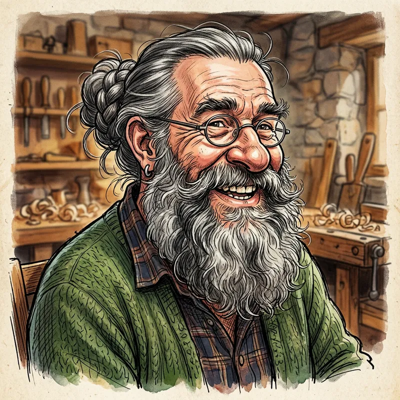 A caricature of a bearded man, his beard is full and notably beginning to grey. His long hair is also tied back neatly. His features are exaggerated, as typical in caricature art.