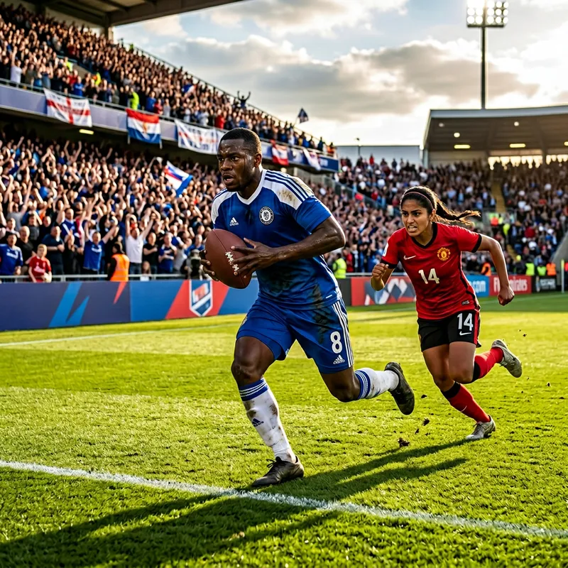 A dynamic scene on a lush, green football field. In the foreground, a Black male football player is sprinting with the ball clasped tightly in his hands, his face determined and focused. In the background, a South Asian female footballer is chasing him, her face reflecting the intensity of the match. Spectators are filled with anticipation as they watch from the stands. The sun above casts long, dramatic shadows across the action. The atmosphere is filled with tense excitement.