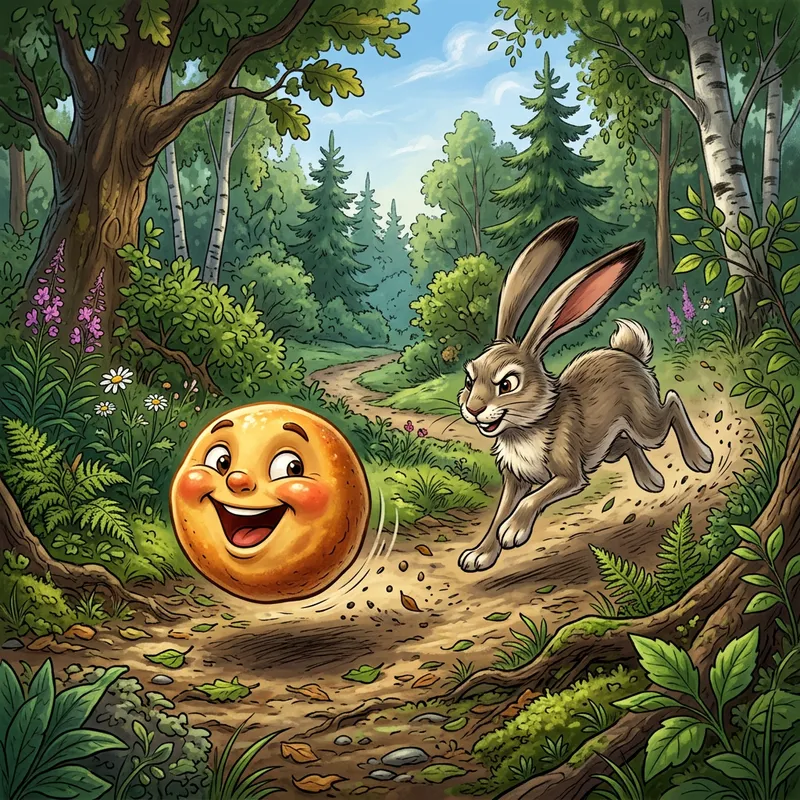 An action-packed scene featuring an anthropomorphic round pastry known as Kolobok and a hare. The Kolobok, brought to life in Eastern Slavic folklore, is jaunty and expressive, almost glowing with a golden crust, and animated eyes and mouth. The hare, on the other hand, boasts long ears, a fluffy tail, and a mischievous glint in its eyes, ready to engage in whatever energetic activity awaits. The two characters are set amidst a lush forest setting, filled with tall, verdant trees, intricate foliage, and a clear blue sky peeking from above. Noteworthy is the vibrant detailing of their dynamic poses, engaging in a lively chase scene.