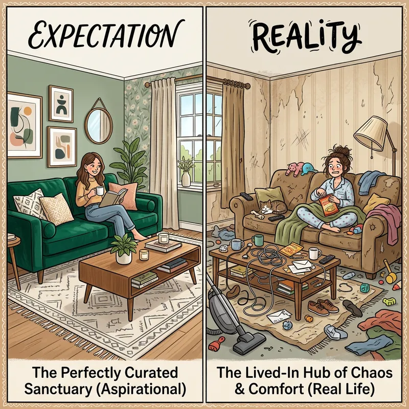 A humorous expectation versus reality meme focused on interior design. On the left, the 'expectation' side, depict a beautifully decorated room with carefully arranged furniture, wall hangings, and vibrant color themes. On the right, the 'reality' side, show a room with mismatched furniture, peeling wallpaper, and clutter everywhere. Both scenes should be presented in a light-hearted and comical manner without ridiculing anyone.