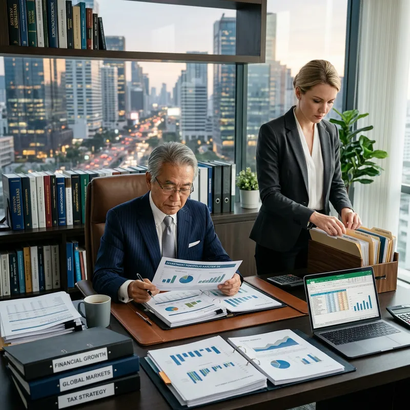 A competent financial consultant. This person is sitting behind a wooden desk stacked with financial reports and charts. A laptop with complex spreadsheets is open. The office backdrop boasts of bookshelves filled with finance books accompanied by a large glass window overlooking the city. The consultant, an elderly Asian man, is attentively examining some documents, while his blonde Caucasian female assistant is organizing papers nearby. Both are elegantly dressed in professional attire.