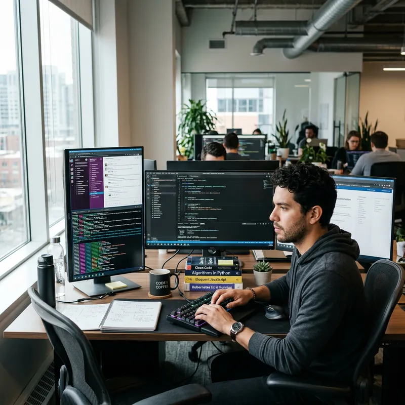 A scene of a mixed race (Hispanic and Caucasian) male programmer working diligently at his computer in a modern office space. He is surrounded by multiple screens displaying various code languages and debugging software. His desk is cluttered with tech books, coffee mug, and a small plant. Light from a window gently illuminates the room and casts a soft glow on his serious, focused face.
