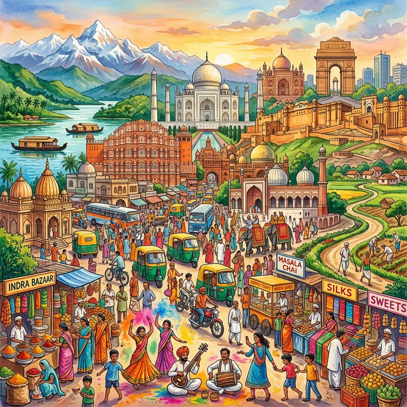 An artistic rendition of India without its current political leader, focusing on the landscapes, vibrant cityscapes, and the diverse cultures in the country. The image could feature bustling markets, grand architectural structures, serene rural landscapes and bustling urban streets.