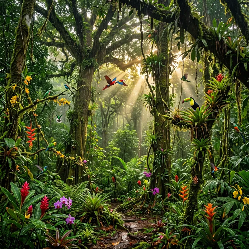 Visualize a vibrant and lush rainforest, full of diverse flora. Tall trees with thick trunks towering towards the sky filled with a variety of birds flying between them. A forest din fills the air with the scent of wet earth and rich plant-life. Exotic flowers bloom in bright bursts of color along the forest floor, on tree branches, and on vine covered canopies. Water droplets glisten on the leaves from a recently passed shower, shimmering in the shafts of sunlight breaking through the thick forest canopy above. This scenery offers a beautiful, serene, and untouched portrait of nature.