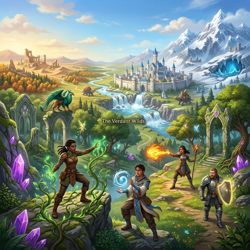 Create an image of a fantasy-themed game world, full of vibrant natural landscapes, historical ruins, and mystical creatures. The game world is divided into multiple regions, each with its own unique cultures and environments, from icy mountains to lush forests and grand cities. The game also features characters with various abilities and elemental powers. No direct or indirect mention of copyrighted characters. All characters appearing in the scene should be fictional and original, and they should all exhibit magical abilities such as commanding fire, water or plants. The character designs should be diverse, with a balanced distribution of genders and descents, such as Caucasian, Hispanic, Black, Middle-Eastern, and South Asian.